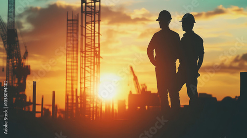 A shadowy image of a builder and a worker stands against the setting sun on a construction site.