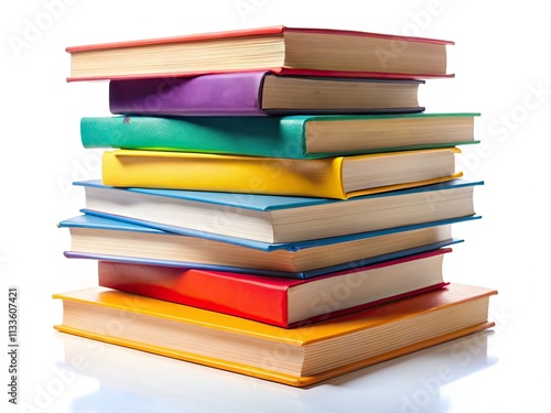 A sharp closeup reveals a towering stack of books against a pristine white background, embodying knowledge and learning.