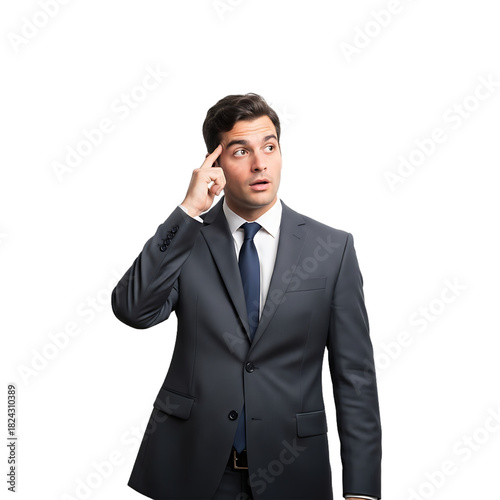 A sharp young executive in a suit pondering an innovative concept or a challenging business problem with deep thought