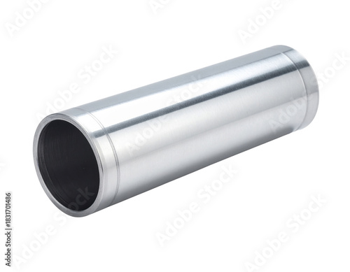 A shiny cylindrical metal tube or sleeve component possibly made of aluminum or stainless steel is angled on a transparent background.