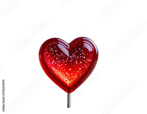 A shiny red heart-shaped lollipop glows with internal starlight against black