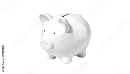 A shiny, white ceramic piggy bank with slot and ears against a black background