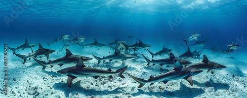 A shoal of hammerhead sharks swimming in formation along the sandy ocean floor