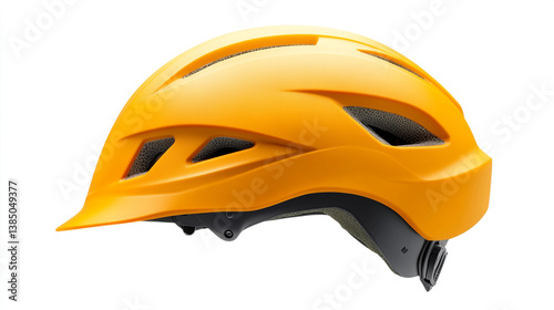 A side view of a bright yellow bicycle helmet with vents on a plain white background for safety gear