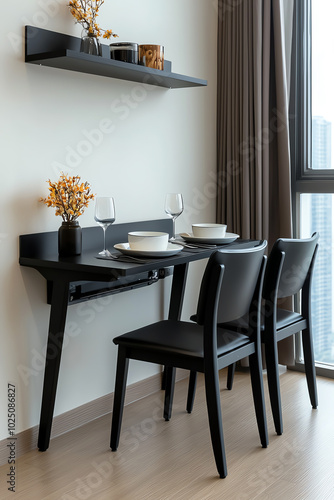 A side view of a small apartment dining space with a foldable dining table, two chairs, and wallmounted shelves