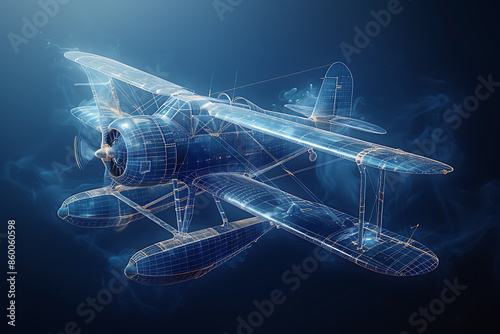 A silhouette logo of a vintage biplane with two stacked wings, soaring through the sky, showcasing classic aviation design and history, in wireframe style on a dark blue background