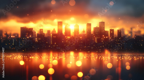 A silhouette of a city skyline with a fiery sunset and reflection in the water.