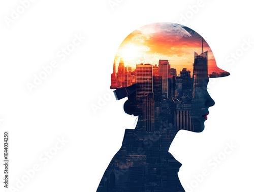 A silhouette of a person wearing a helmet, overlaid with a city skyline and sunset, symbolizing construction, architecture, and urban development.