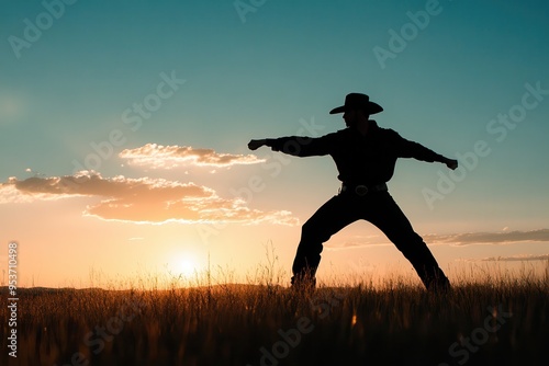 A silhouetted figure in a cowboy hat poses dramatically against a sunset in a grassy field.