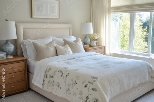 A silk bedspread with intricate chinoiserie embroidery, accented by ceramic bedside lamps.