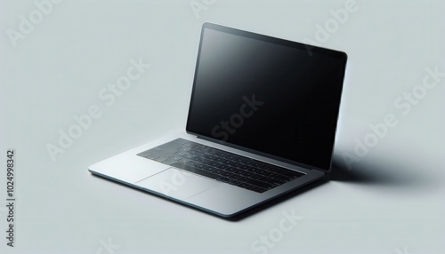 A silver laptop computer with a blank black screen is shown from various angles against a light grey background...Concept: Technology, communication, work from home, online business.