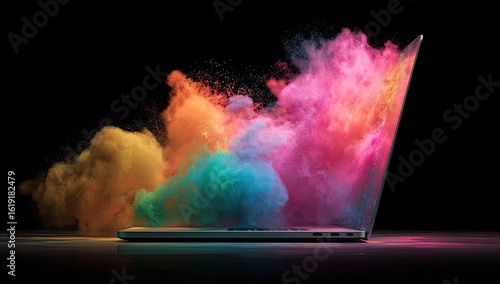 A silver laptop rests on a dark surface, engulfed by a vibrant explosion of multicolored powder; pinks, oranges, teals, and blues dominate the cloud