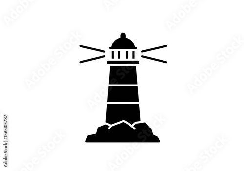 A simple black and white illustration of a lighthouse on rocks with light beams shining out sides