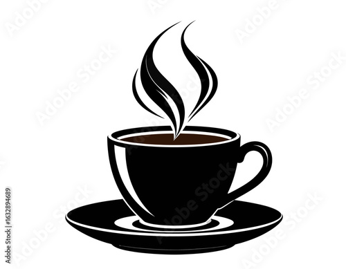 A simple black silhouette of a steaming hot coffee cup on a saucer. This vector graphic is an ideal icon for a cafe or coffee shop logo.