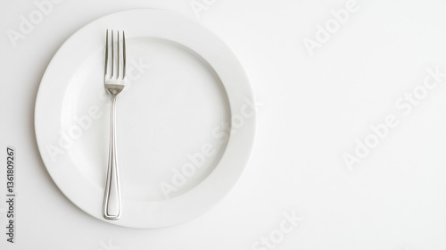 A simple composition of a fork placed on a white plate against a clean white background space view