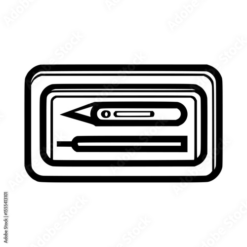 A simple line drawing depicts a rectangular case containing a craft knife and a ruler.