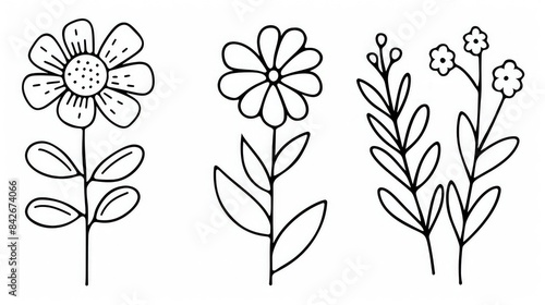 A simple line drawing of three different types of flowers in a clip art style generated with AI