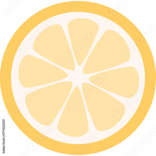 A simple minimalist illustration of a light yellow lemon slice with a thick yellow rind and white segments isolated on a transparent background, citrus fruit graphic.