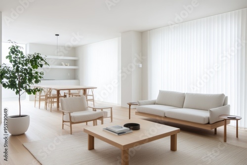 A simple minimalist living space with a balanced furniture arrangement, highlighting harmony and understated elegance.