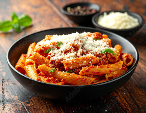 A simple, rustic bowl of red amatriciana pasta is topped with a generous dusting of pecorino cheese.