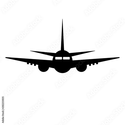 A simple silhouette design of an airplane on a white background