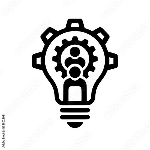 A simple vector illustration featuring a light bulb, a gear, and a silhouette of people.