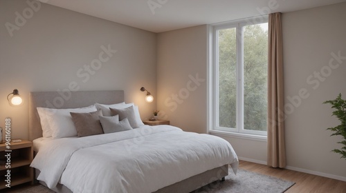 A simple white bedroom with an open window in the room interior design concept.