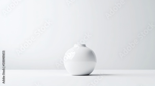 A simple, white vase sits centrally on a white surface. The vase is oval-shaped and features a smooth, glossy finish. The background is a plain white wall, creating a minimalist composition. The ima