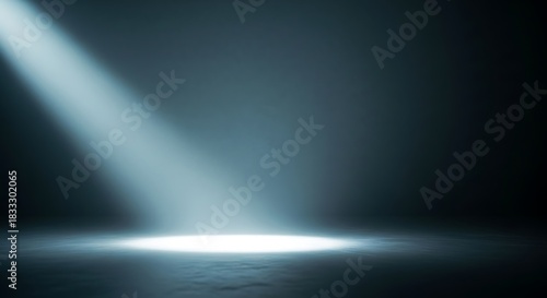 A single beam of light shining down onto a dark stage, illuminating a small circle on the floor with a bright glow