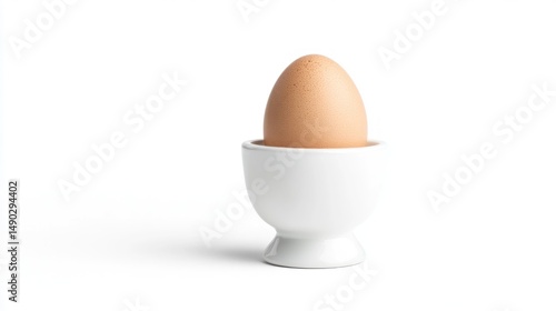 A single brown egg rests in a small, white egg cup against a stark white background (1)
