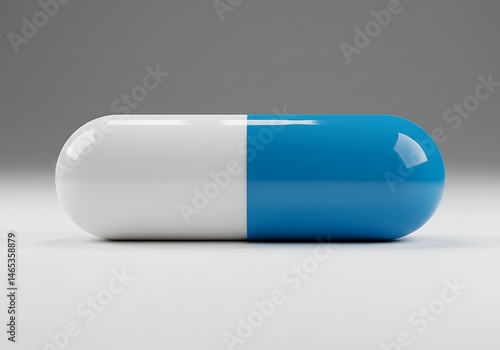 A single capsule with one half white and the other half blue lying on a reflective white surface