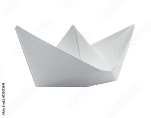 A single, crisp, white paper boat against a stark, black, isolated background