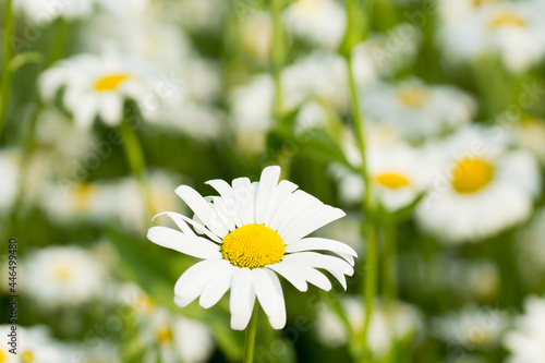 A single daisy flower in the foreground and many more blossoming daisies in the background growing on a meadow in spring