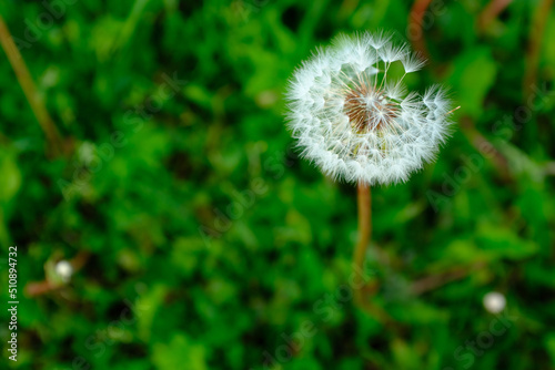 A single dandelion on the bones on the blurred green grass. A fluffy dandelion on a green background for post, screensaver, wallpaper, postcard, poster, banner, cover, website