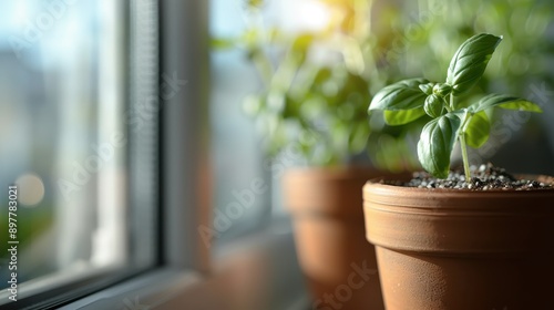 A single herb plant in a terracotta pot sitting on a windowsill, bathed in sunlight, symbolizing simplicity and the nurturing care for one's own culinary ingredients right at home.