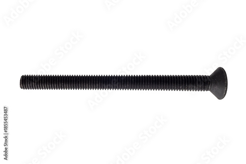 A single long black metal bolt with a flat countersunk head and full threading, isolated on a clean white background.