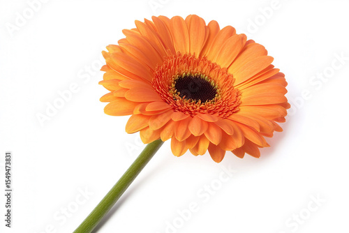 A single orange gerbera daisy with a dark center and green stem on white background