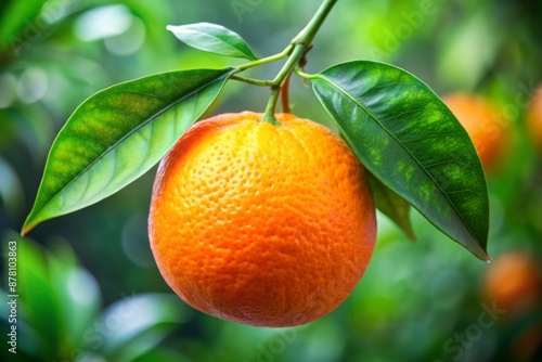 A single orange hanging from a tree with a leaf