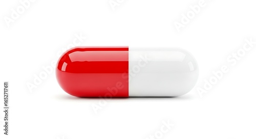 A single red and white pharmaceutical capsule symbolizing medical treatment, healthcare, and pharmacology isolated on a clean white background for wellness concepts.