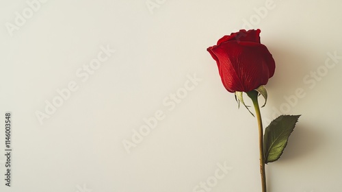 A single red rose set against a soft cream background, close-up shot, Minimalist style