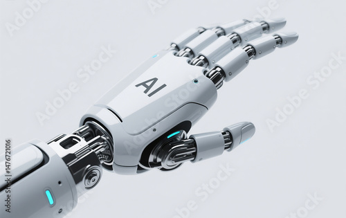 A single robotic hand designed with precision by AI technology, displayed against a clean white background. The design is sleek and futuristic