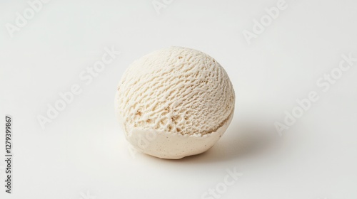 A single scoop of ice cream rests on a clean white surface, showcasing its smooth texture and inviting colors.