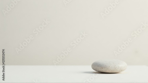 A single, smooth, off-white stone rests on a pristine white surface against a muted, creamy backdrop
