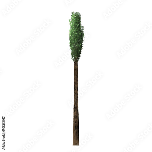 A single tall tree with green foliage and brown trunk isolated against a black background in center frame