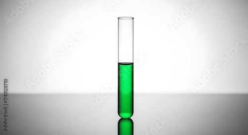 A single test tube filled with a bright green liquid on a reflective surface against white backdrop