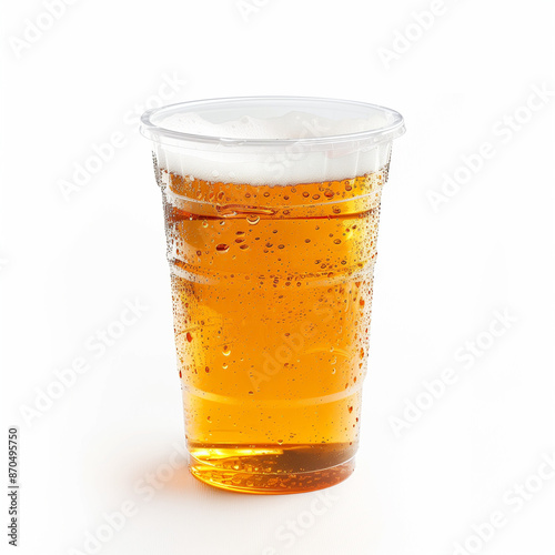 a single transparent plastic cup filled with beer, isolated on white background, side view