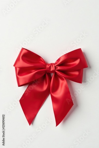 A single, vibrant red satin ribbon bow, elegantly tied, isolated against a plain white background, perfect for gift-wrapping designs and festive celebrations.