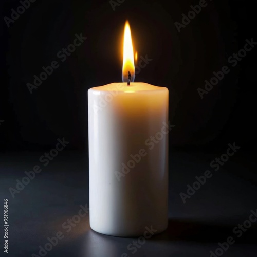 A single white candle burns steadily in a dark environment, with its flame glowing warmly against the black background
