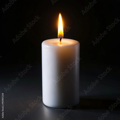 A single white candle burns steadily in a dark environment, with its flame glowing warmly against the black background