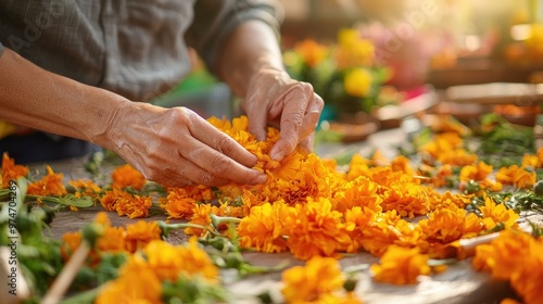 A skilled artisan's hands delicately craft a vibrant handmade marigold garland, showcasing intricate floral details while leaving ample space to the side for additional text or design elements.